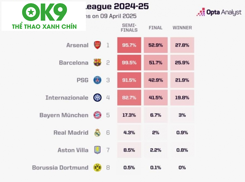 Mặc dù Barcelona đang trình diễn sức mạnh đáng gờm tại Champions League, siêu máy tính Opta lại bất ngờ đánh giá Arsenal là ứng cử viên sáng giá nhất cho chức vô địch mùa giải 2024/25. Theo dõi tin tức thể thao mới nhất tại OK9. Bất ngờ từ Siêu Máy Tính: Arsenal Vượt […]